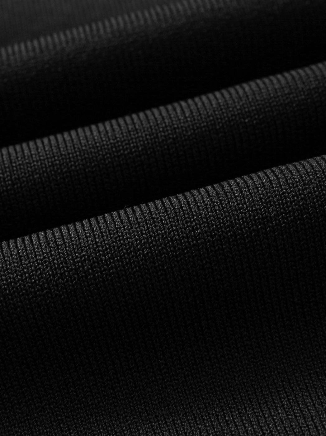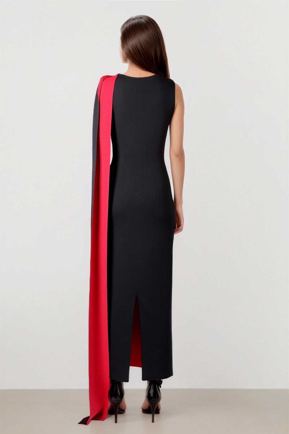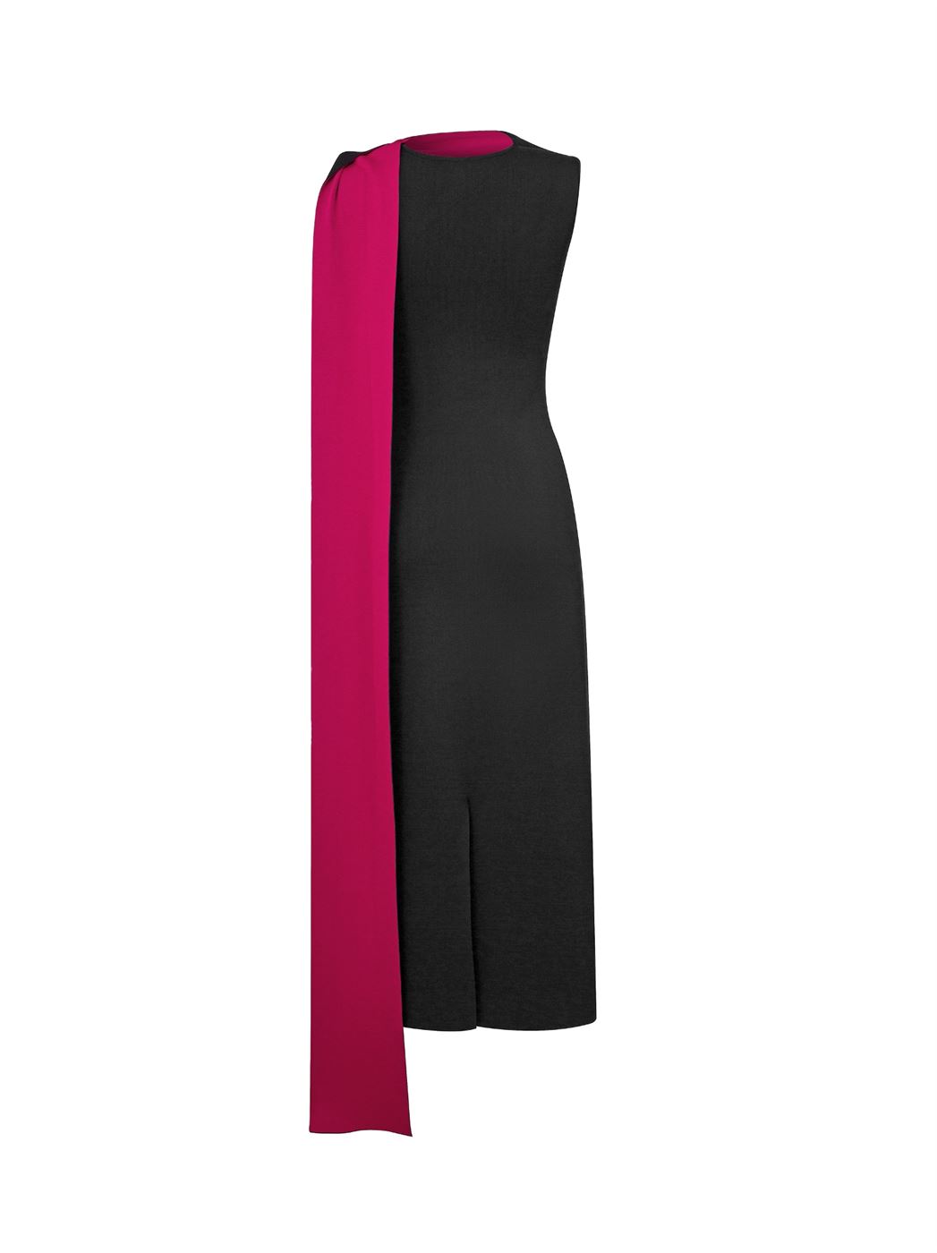 Description: Elegant and unique, this black and fuchsia knit dress features double knitting in two tones for a bold effect. Styled with a midi length, fitted shape, and a scarf detail attached at the shoulder seam, it’s a statement piece for modern elegance
