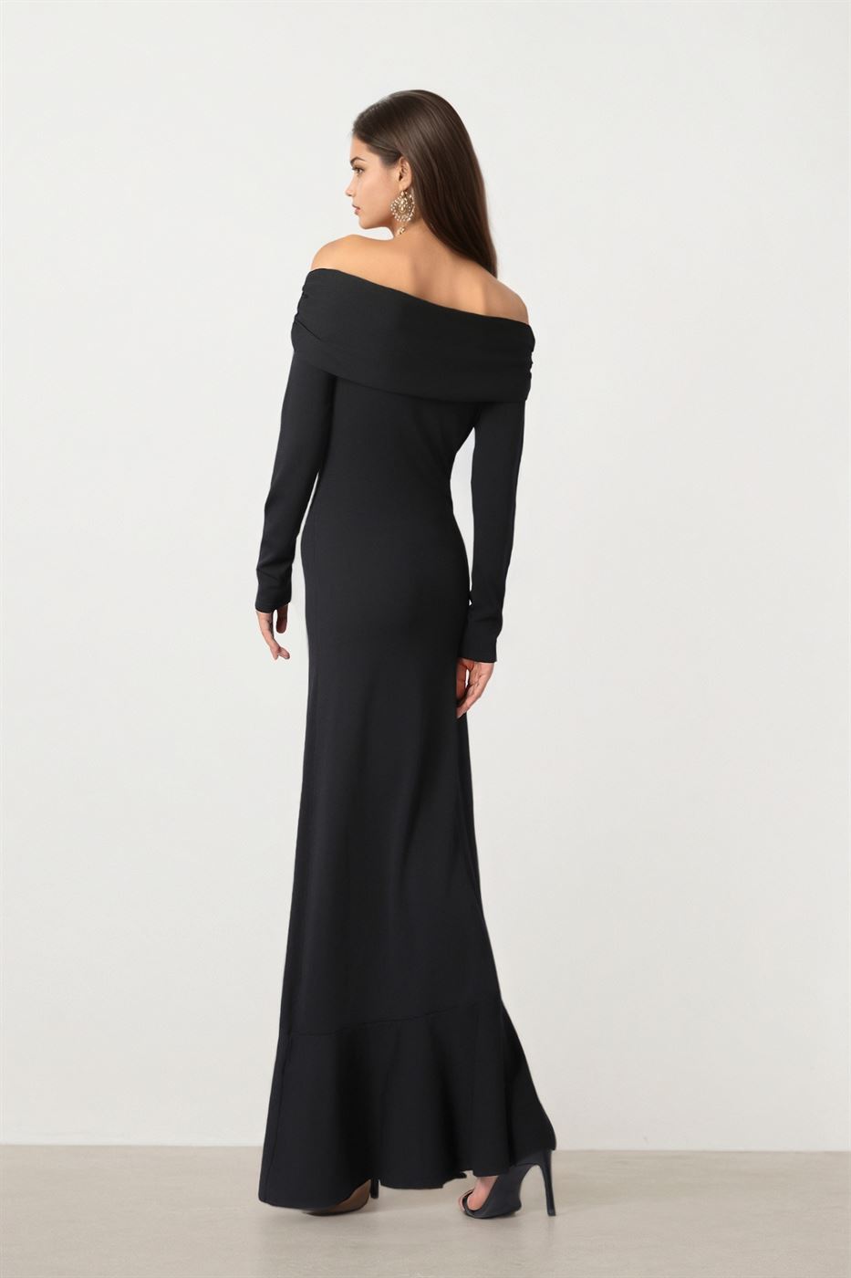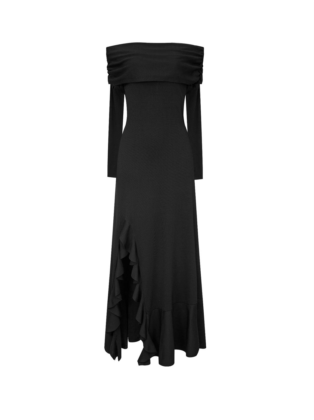 Description: Elegant and dramatic, this black knit dress features an off-shoulder neckline with long sleeves for a refined silhouette. The front slit with ruffle detailing adds movement and sophistication, while the full-length cut makes it perfect for evening occasions.
