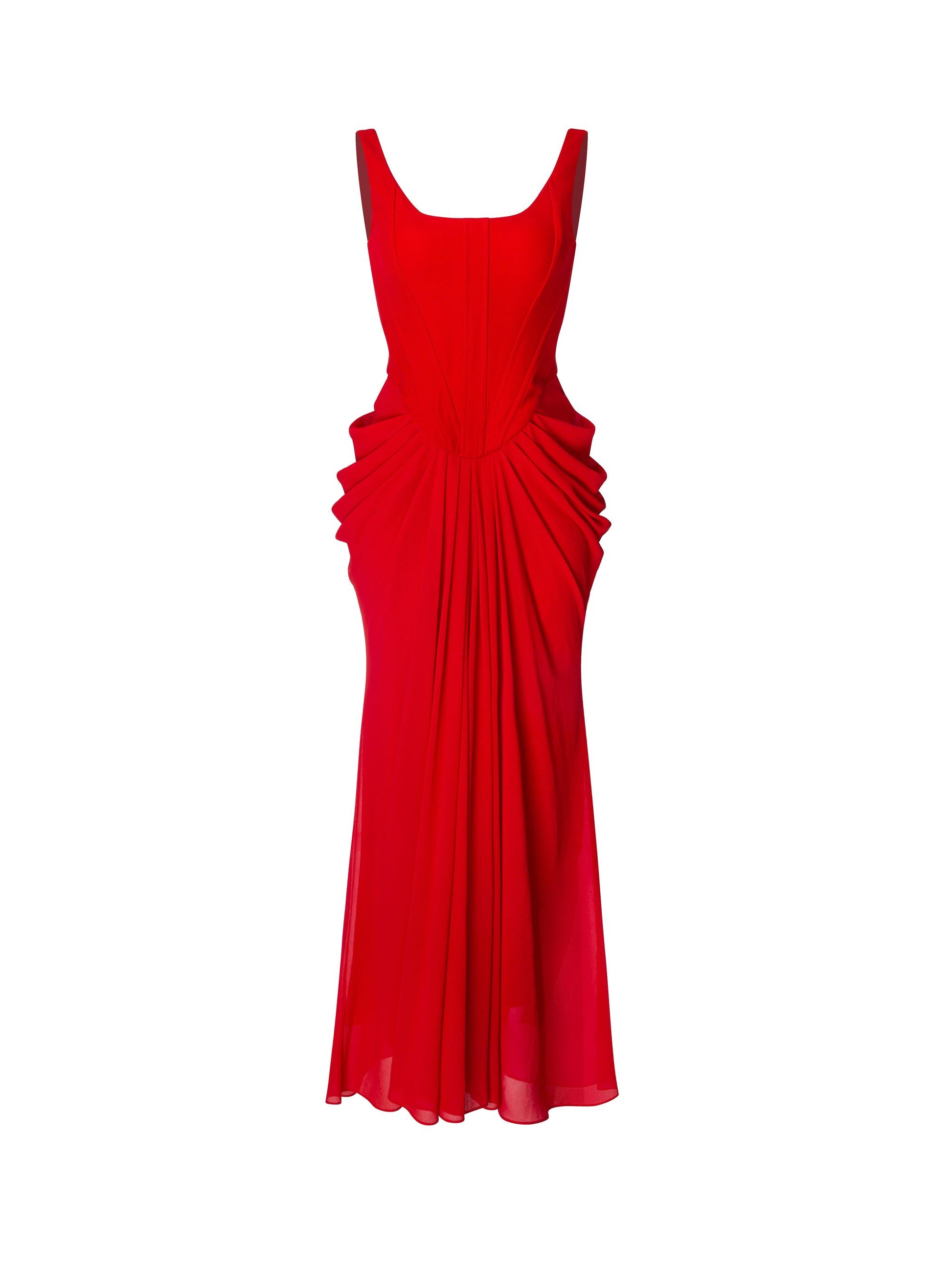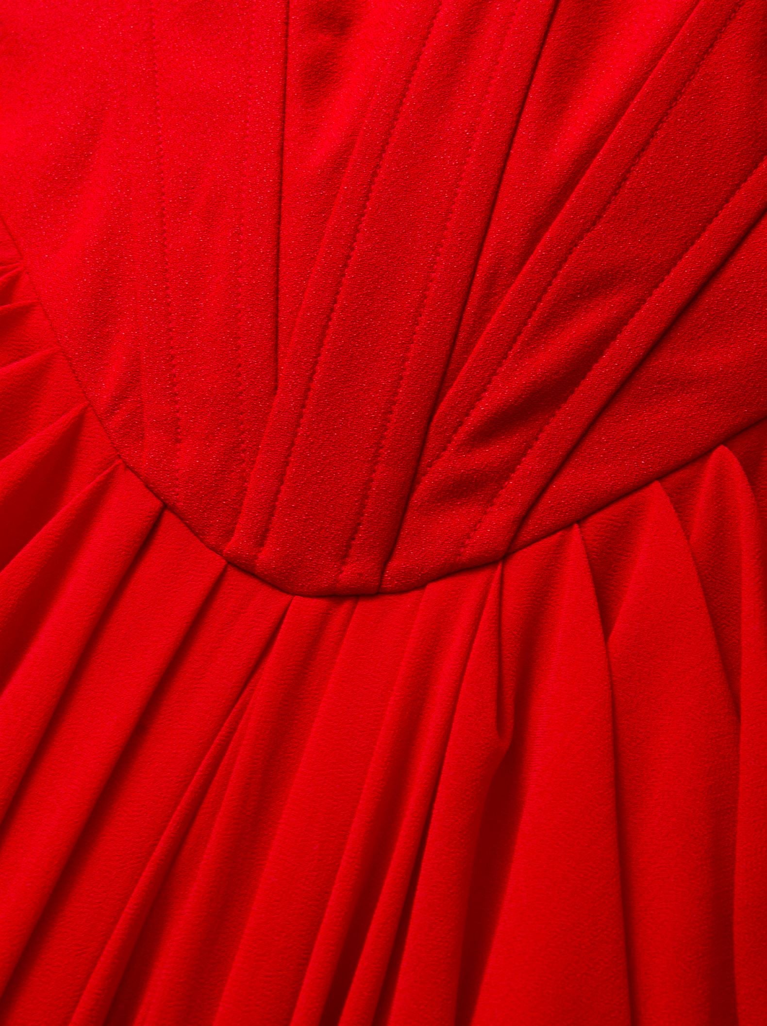 Description: An elegant red maxi dress designed with a delicate shoulder strap and open neckline. Crafted from a combination of crepe satin and chiffon, it features a structured fishbone upper bodice for support and shape. The pleated draping flows beautifully along the length, creating a graceful and feminine silhouette ideal for evening occasions.