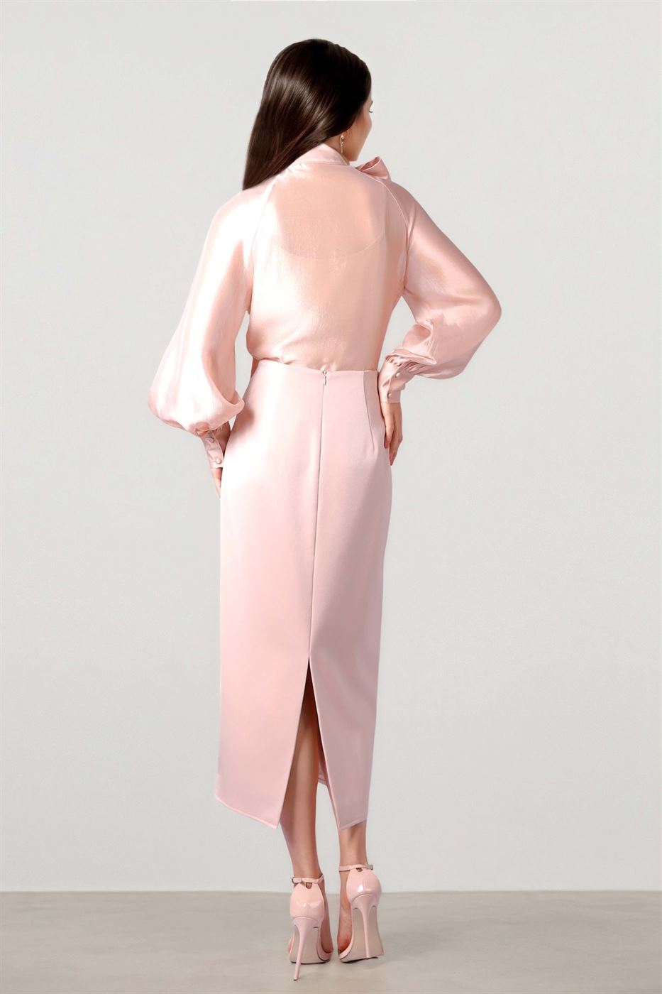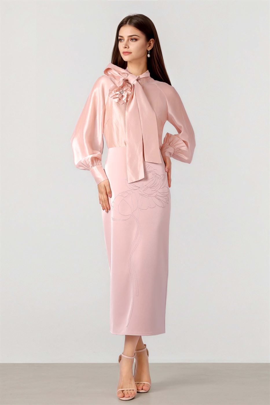 Description: Elegant and versatile, this pink crepe midi skirt is crafted with a sleek side zip closure and a stylish back slit for ease of movement. Featuring delicate 3D embroidered flower details, it adds a feminine charm to your look. Perfect for pairing with blouses or tailored tops for elegant look.
