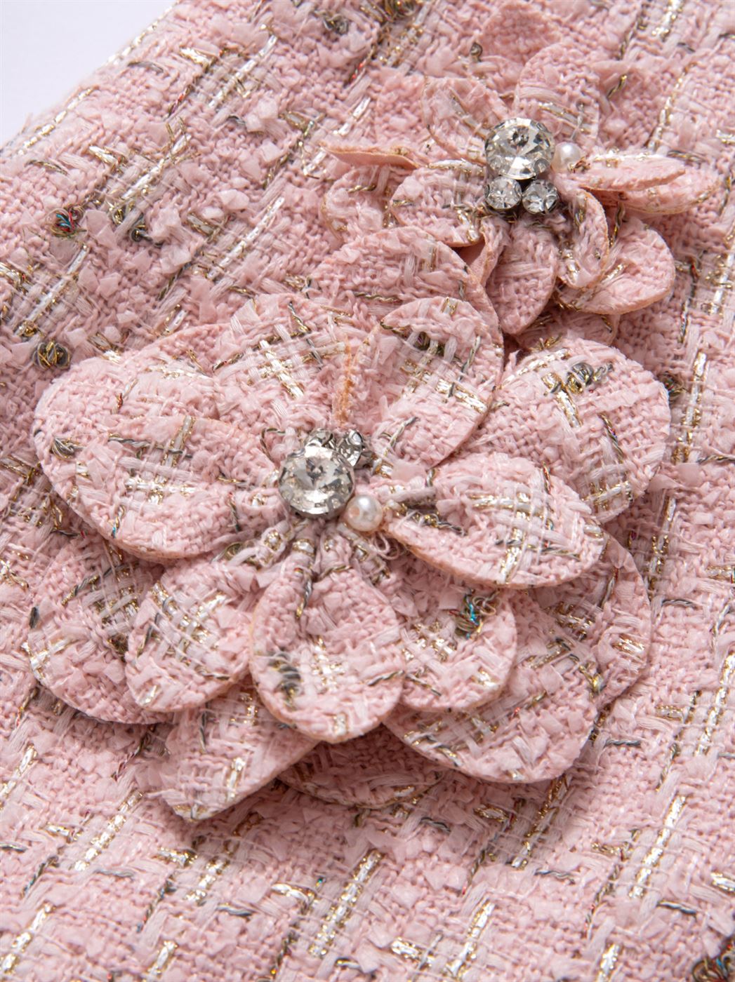 Description: Elevate your style with this light pink tweed midi dress. Designed with a fitted body, it offers a flattering, feminine silhouette. A center back zipper ensures easy wear, while a slit at the back hem adds a modern touch. Perfect for formal events or elegant gatherings, this dress blends timeless sophistication with chic detailing.