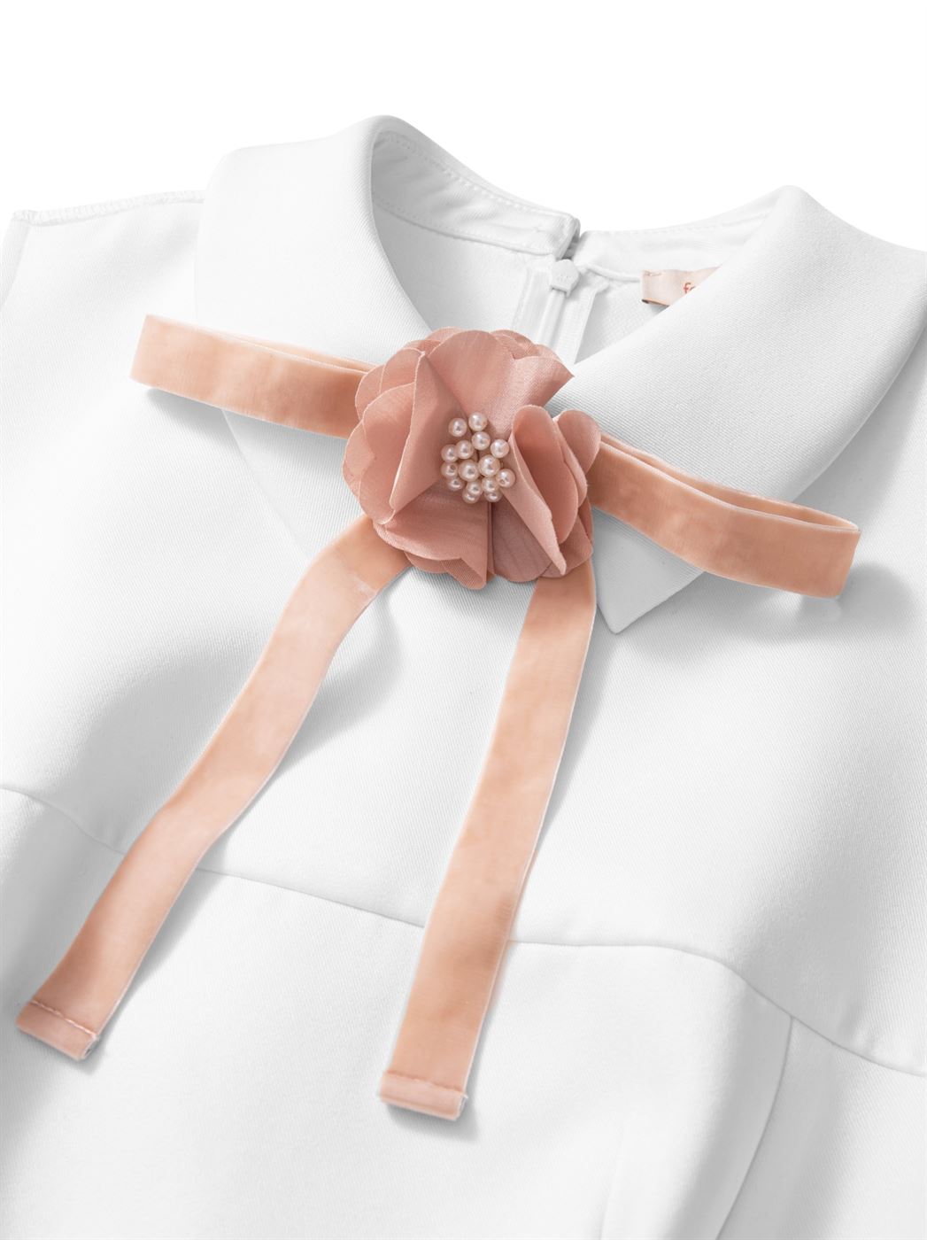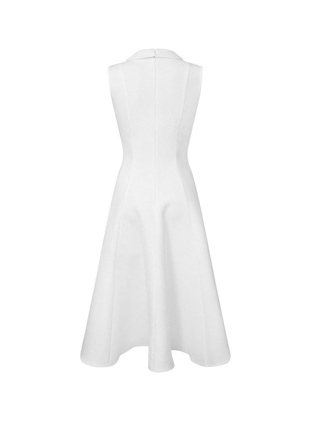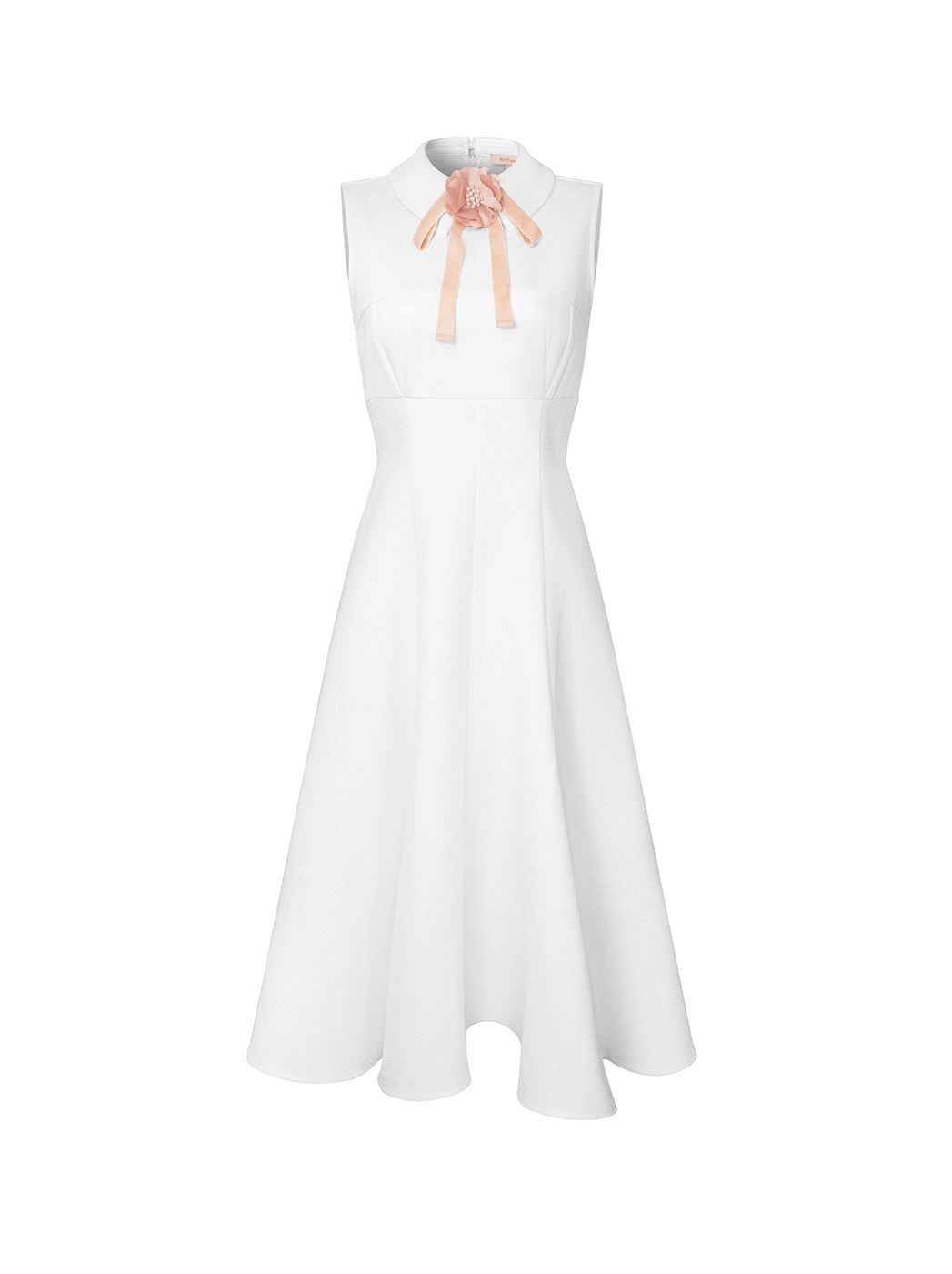 Description: Grace meets sophistication in this off-white midi dress, crafted from a refined blend of tweed and crepe fabrics. Featuring a collar adorned with a brooch and a sleeveless silhouette, it offers timeless elegance. The mid-back teardrop cut-out adds a delicate details, while the side zip closure ensures comfort and ease. Perfect for formal occasions or chic daytime gatherings.