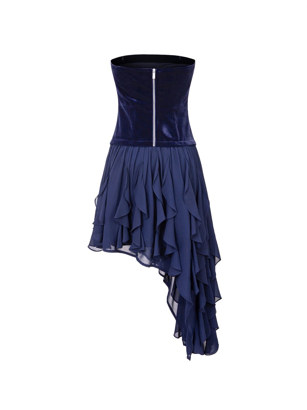 Description: Elegant and dramatic, this dark blue velvet dress features a fitted bodice with a metallic back zipper for a sleek fit. The asymmetric chiffon ruffle hem adds movement and flair, making it a standout choice for evening events.