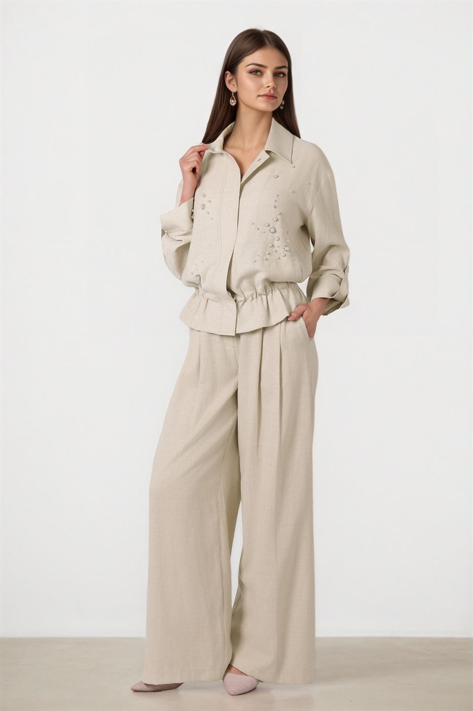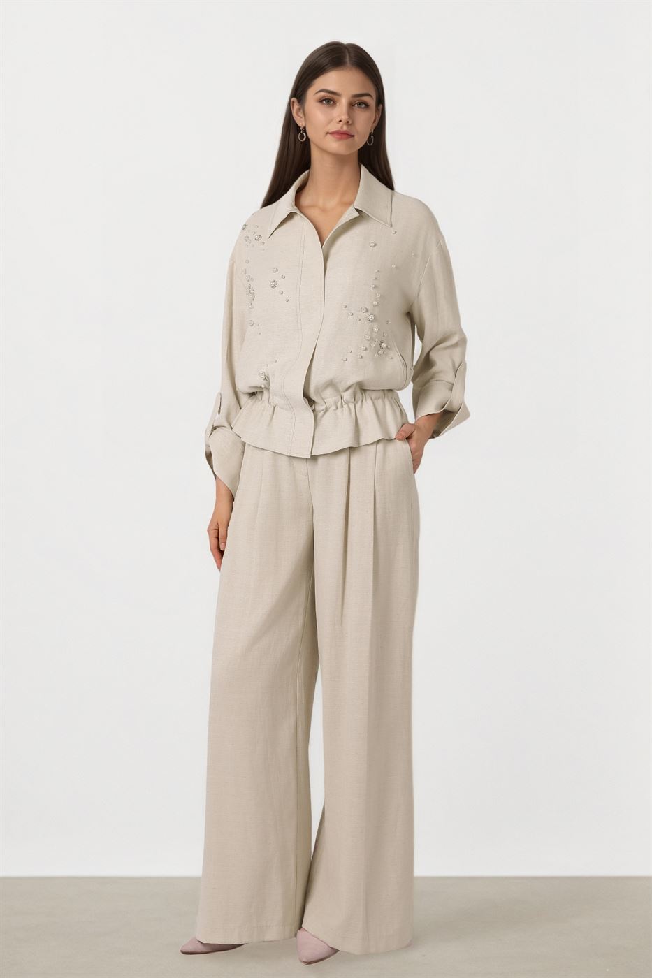Description: Add effortless elegance to your wardrobe with this beige embellished top with pearls and crystals , crafted from a soft linen blend. Designed with a loose body fit for comfort and long sleeves for a refined finish, it combines ease with sophistication. Perfect for pairing with skirts or tailored pants, making it a versatile choice for day or evening wear.