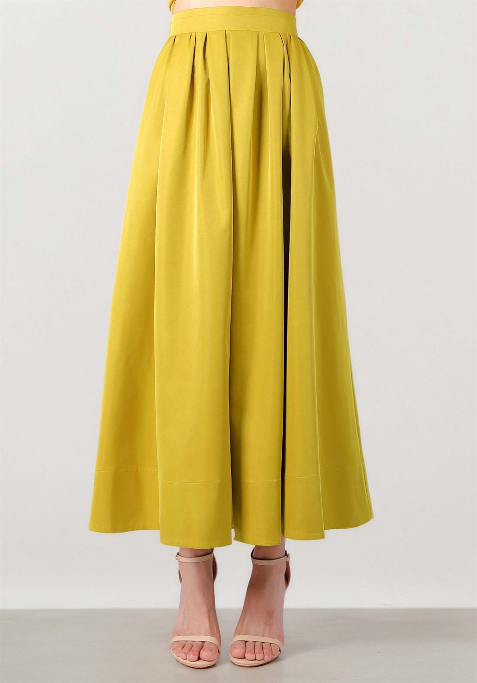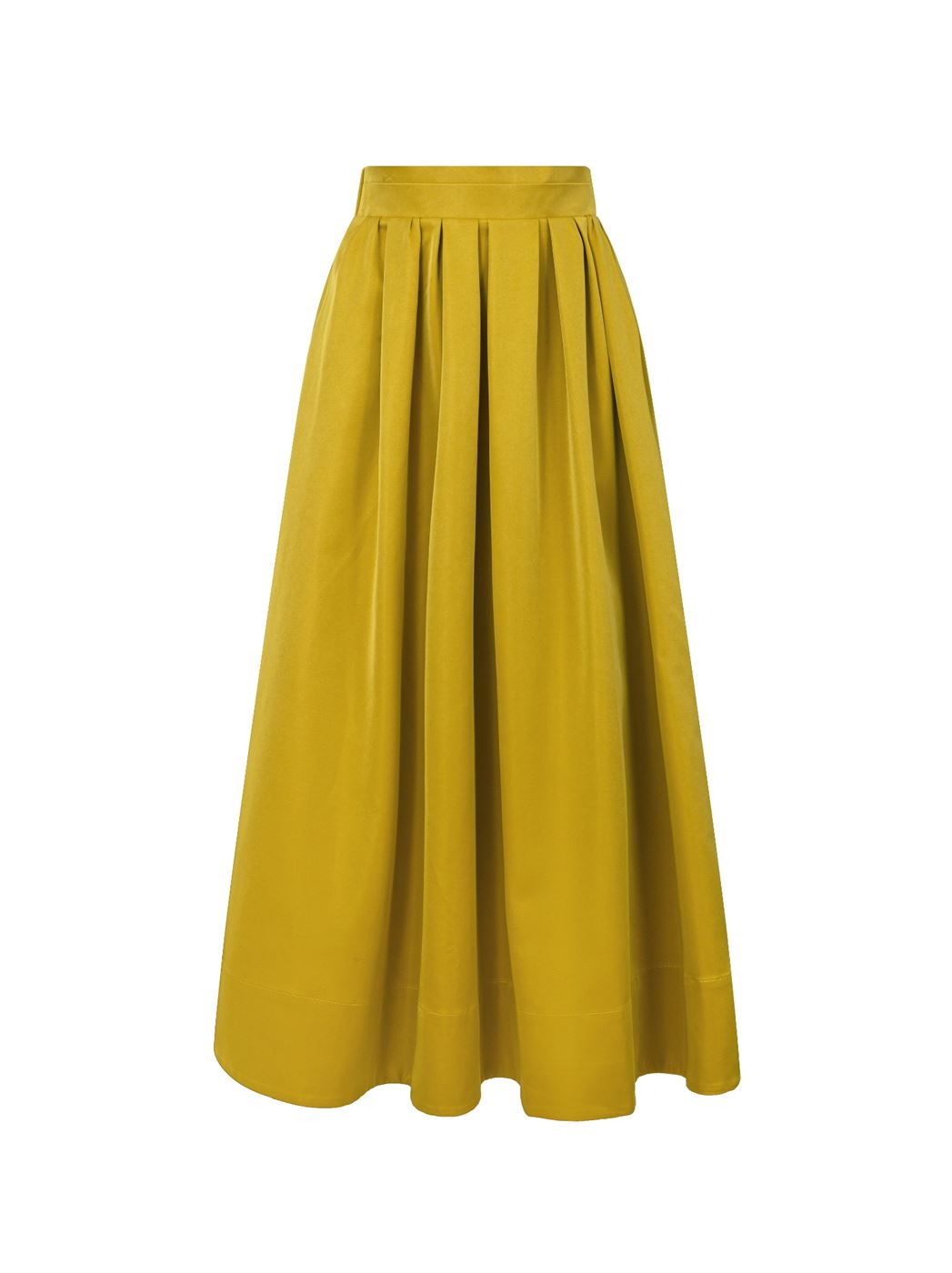 Description: Elegant and versatile, this olive cotton hand-feel taffeta skirt is designed at a midi length with an elastic waistband at the back for comfort. Finished with a side seam zip, it combines practicality with refined style. Perfect for both casual chic and semi-formal outfits.