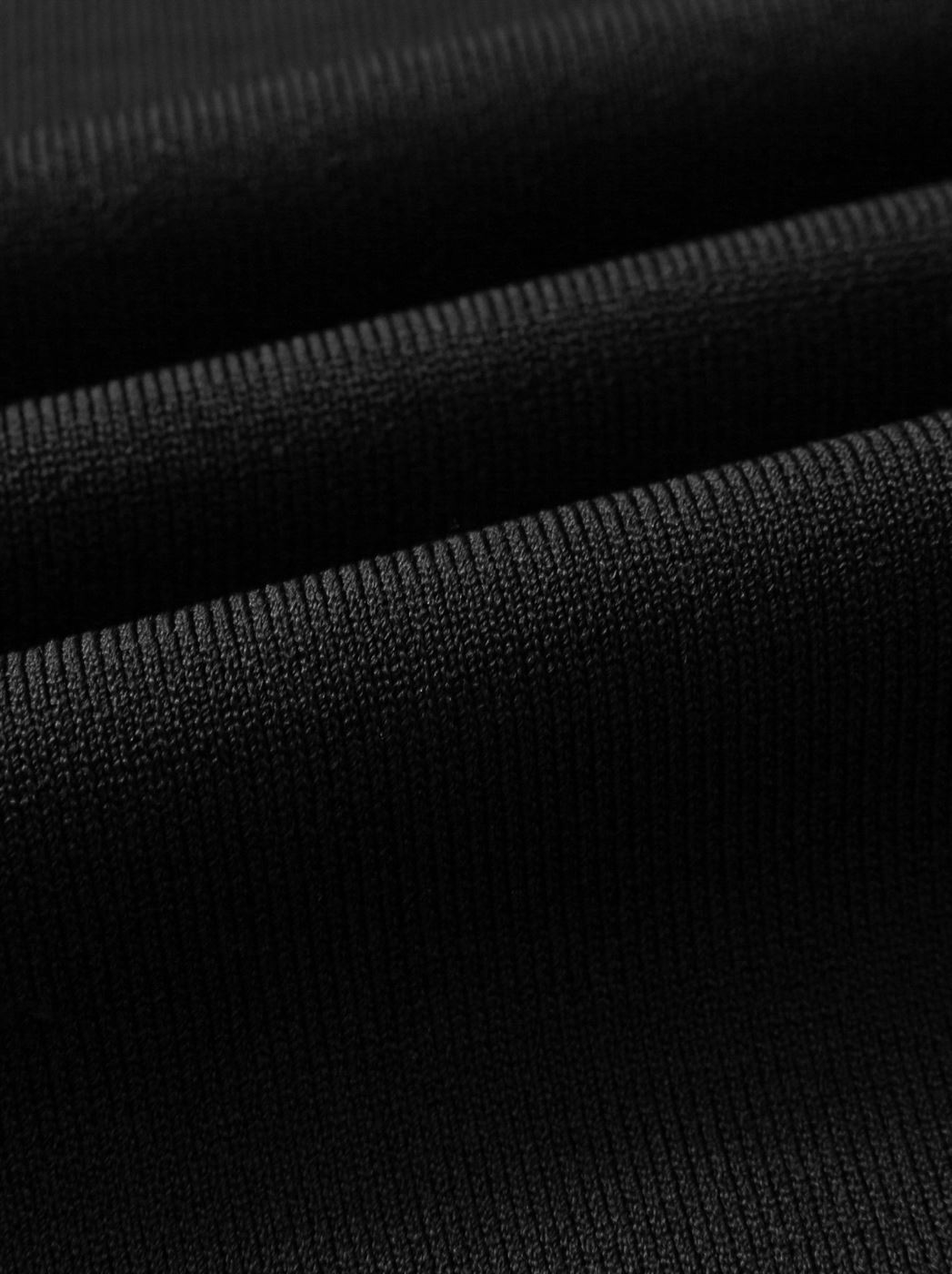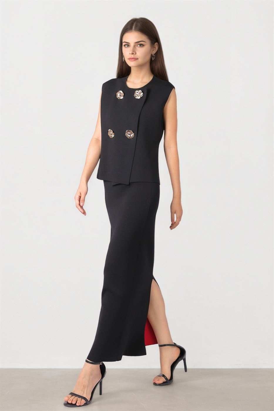 Description: Modern and sleek, this black and fuchsia knit skirt features an elastic waistband for comfort. The column shape and long midi length elongate the silhouette, while the double knit in two colors adds a refined detail. Ideal for versatile styling.