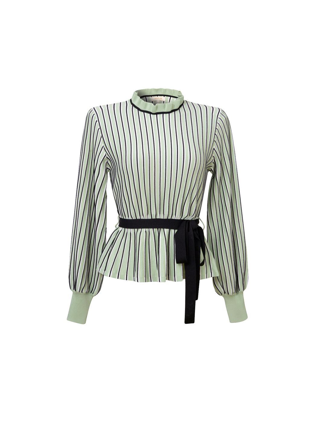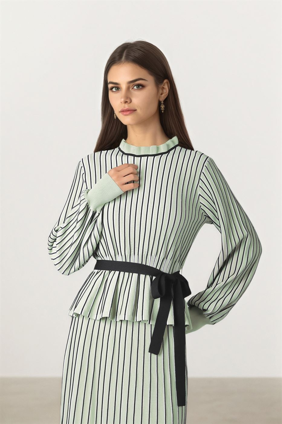 Description: Elevate your knitwear collection with this mint pullover, featuring a chic ruffle collar and elegant balloon sleeves. Designed with a striped knit pattern in mint, black, and off-white, it combines playful details with sophisticated style. Perfect for pairing with skirts or tailored pants for a polished yet feminine look.