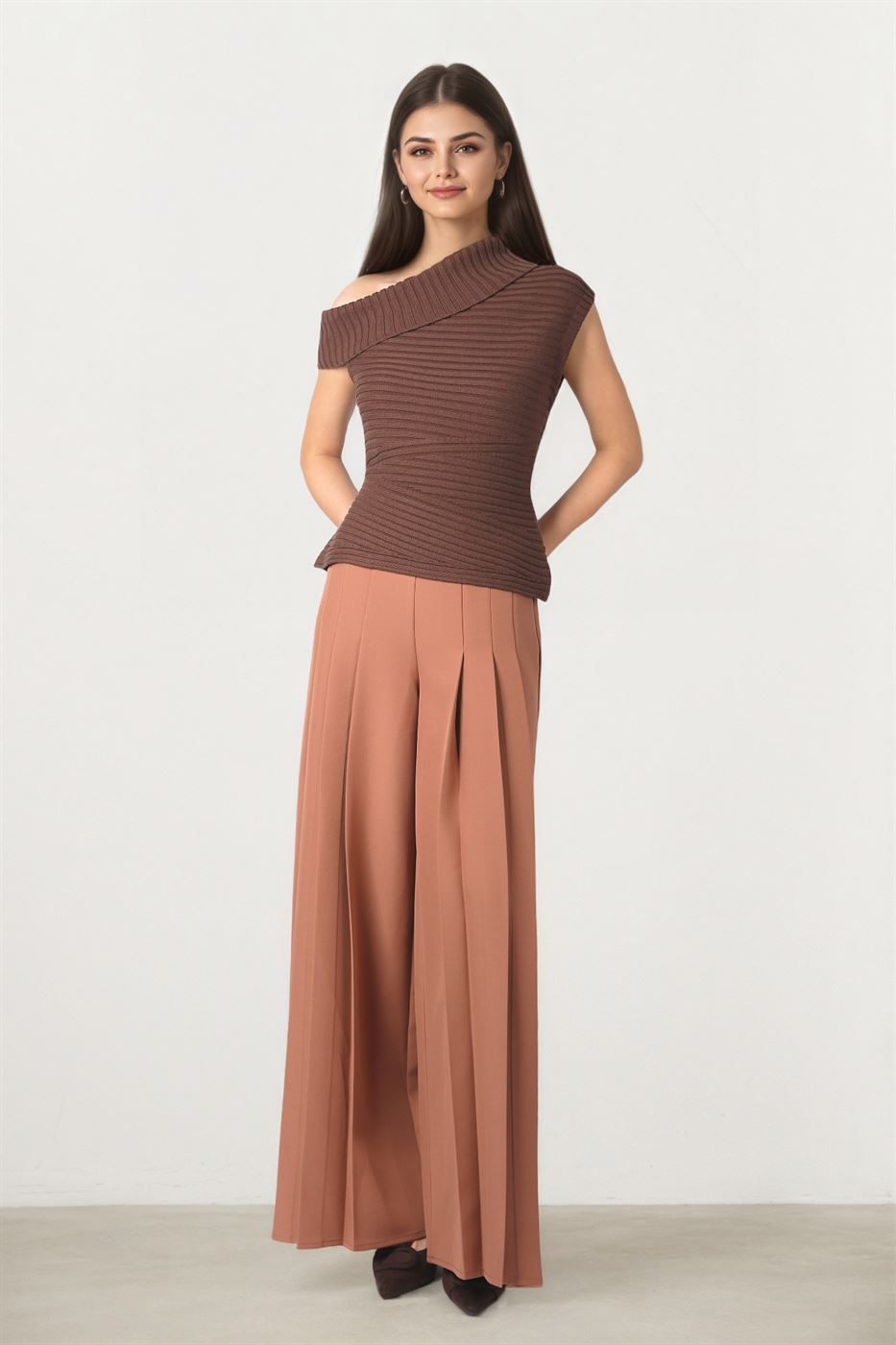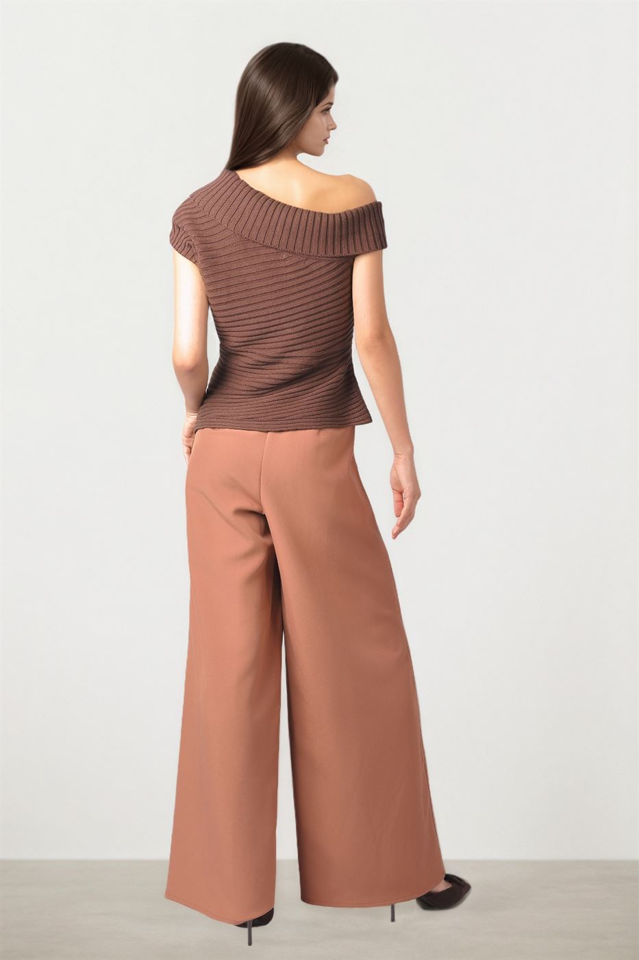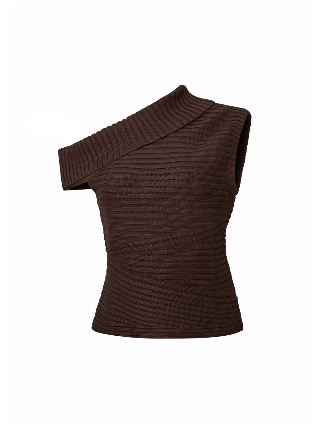 Description: Elevate your knitwear collection with this brown ribbed pullover, featuring an asymmetric folded neckline for a modern twist. Designed with a fitted body and crafted from soft ribbed knit fabric, it offers both structure and comfort. Perfect for pairing with high-waisted trousers or skirts for a chic, everyday look.