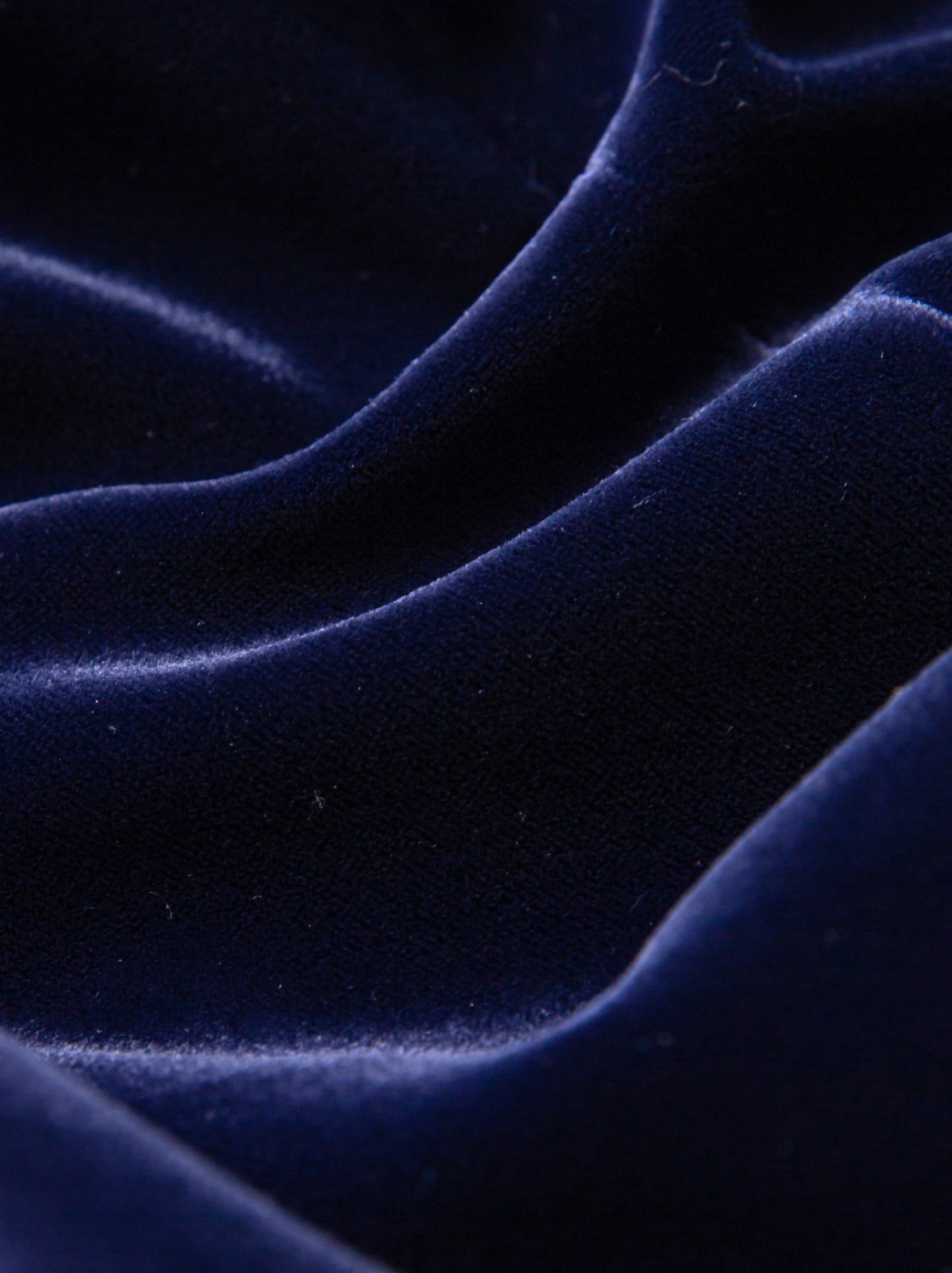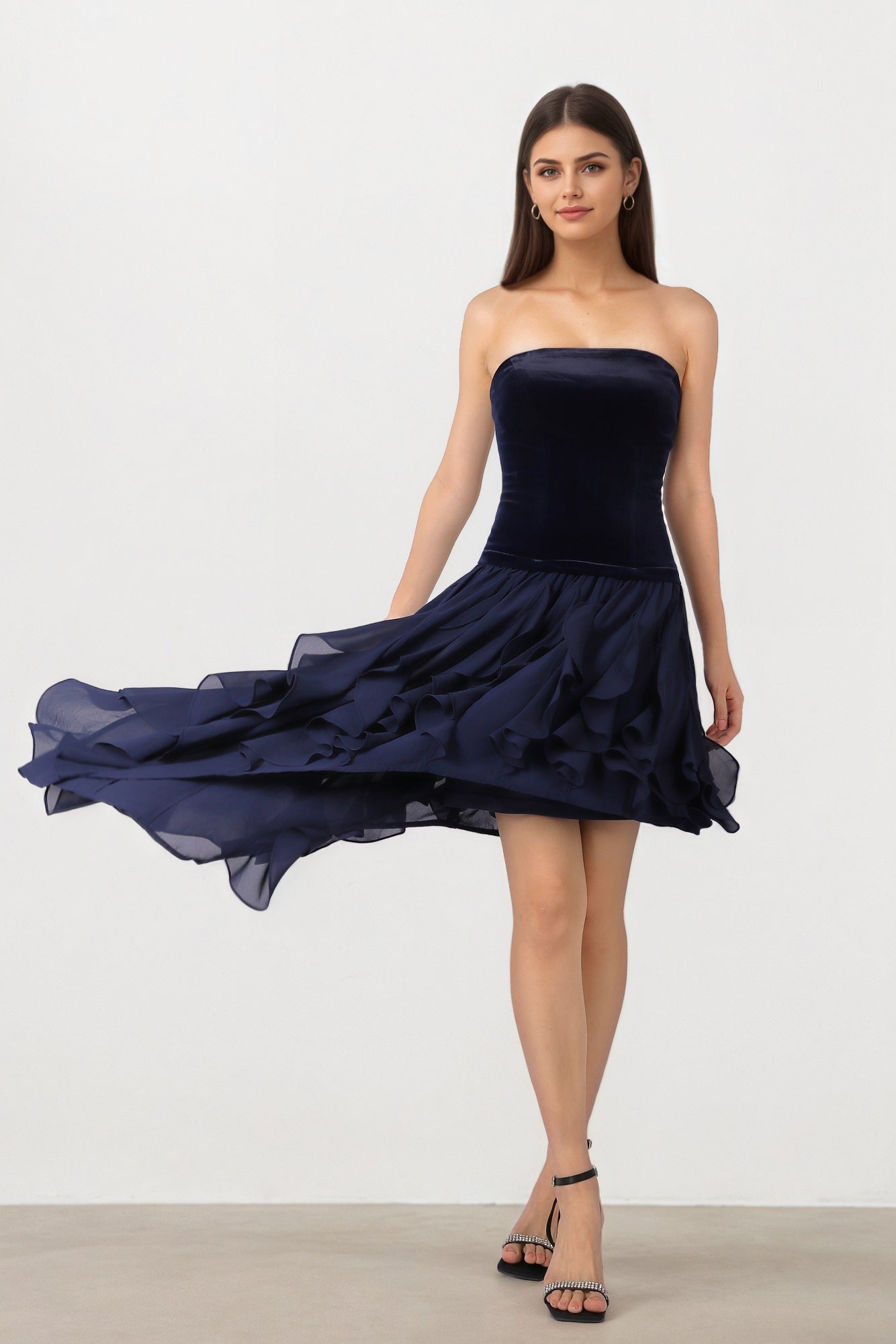 Description: Elegant and dramatic, this dark blue velvet dress features a fitted bodice with a metallic back zipper for a sleek fit. The asymmetric chiffon ruffle hem adds movement and flair, making it a standout choice for evening events.