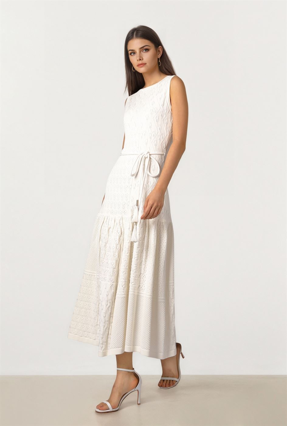 Description: Off-white knit midi dress designed with a clean sleeveless silhouette and subtle texture. Features a relaxed fit with gentle drape that enhances everyday comfort. The minimalist design makes it versatile for casual or refined styling.