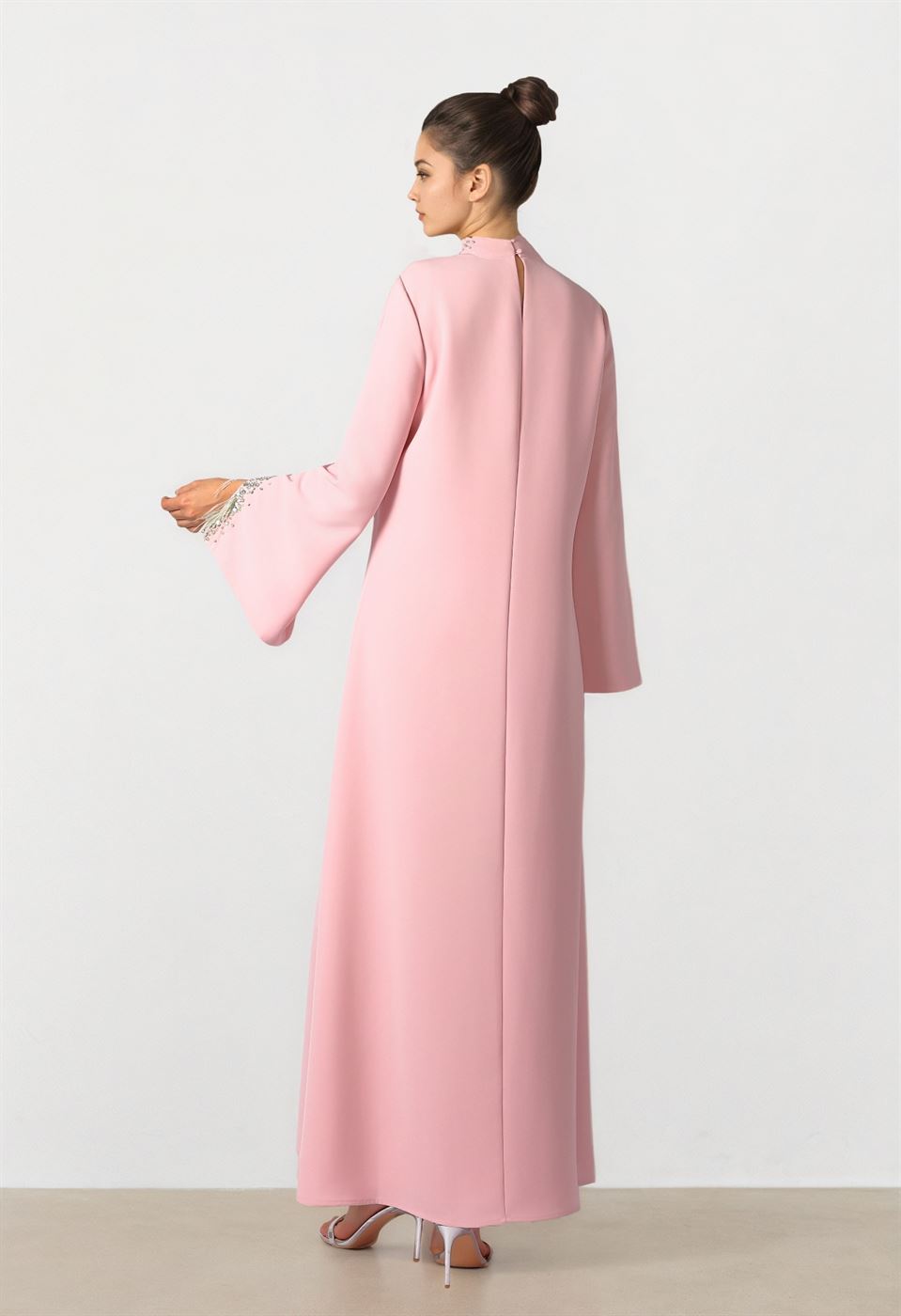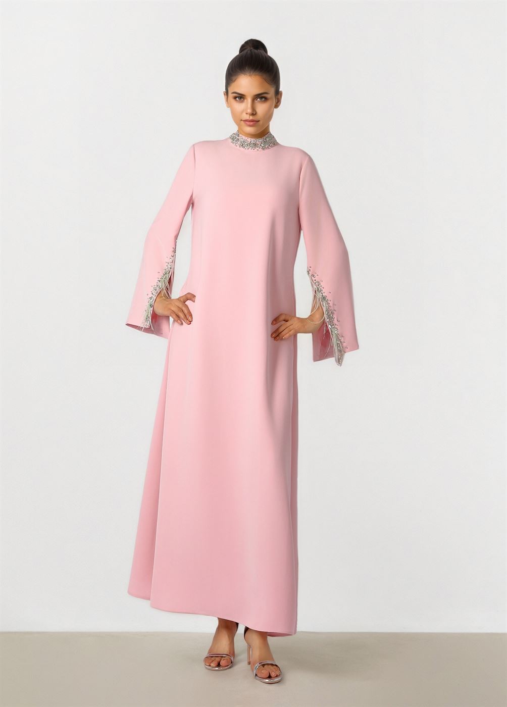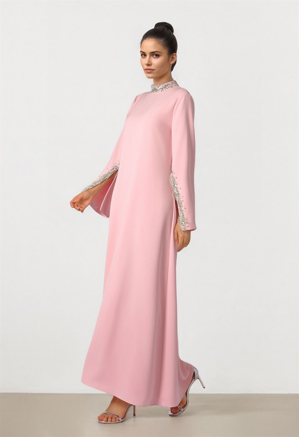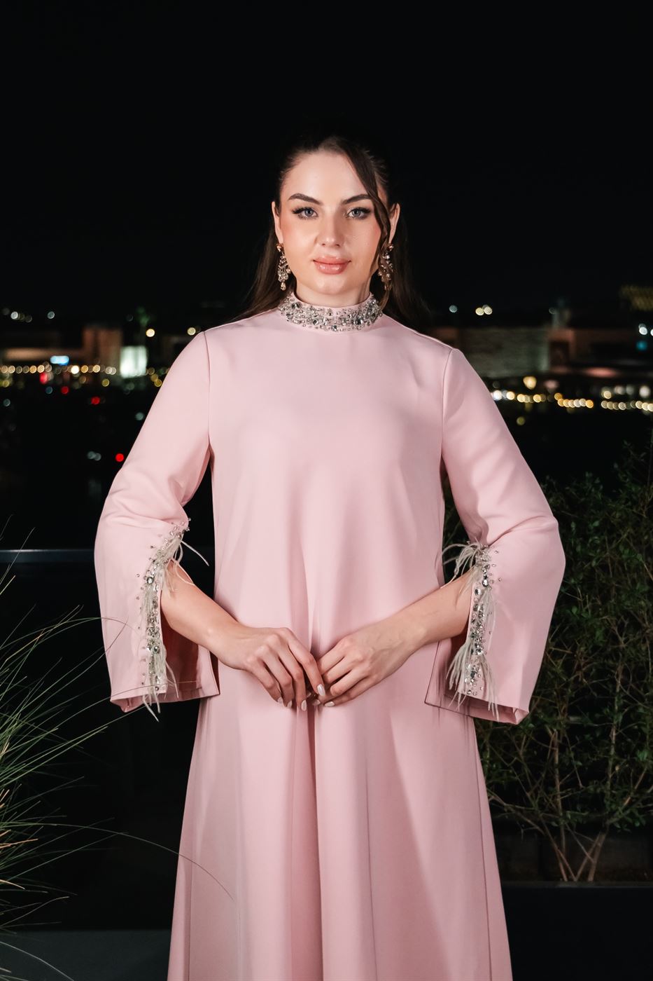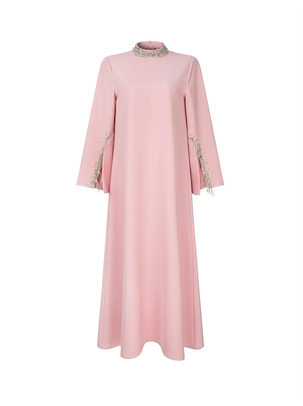 Description: Pink crepe dress designed with feather embellishment accents that add a soft statement touch. Features a clean straight silhouette with long sleeves and a fluid drape. Smooth crepe fabric ensures comfort while maintaining an elegant, modern look.