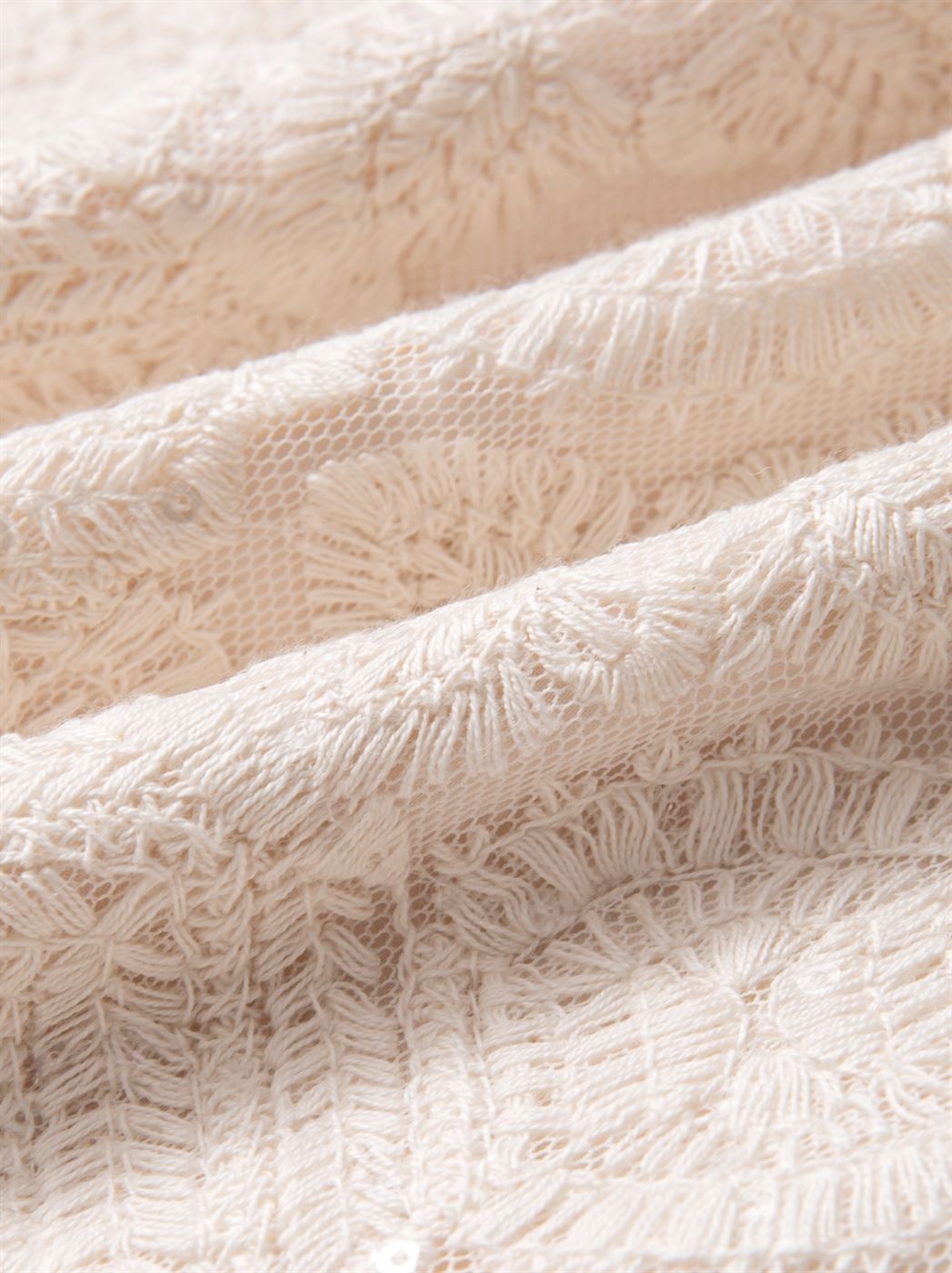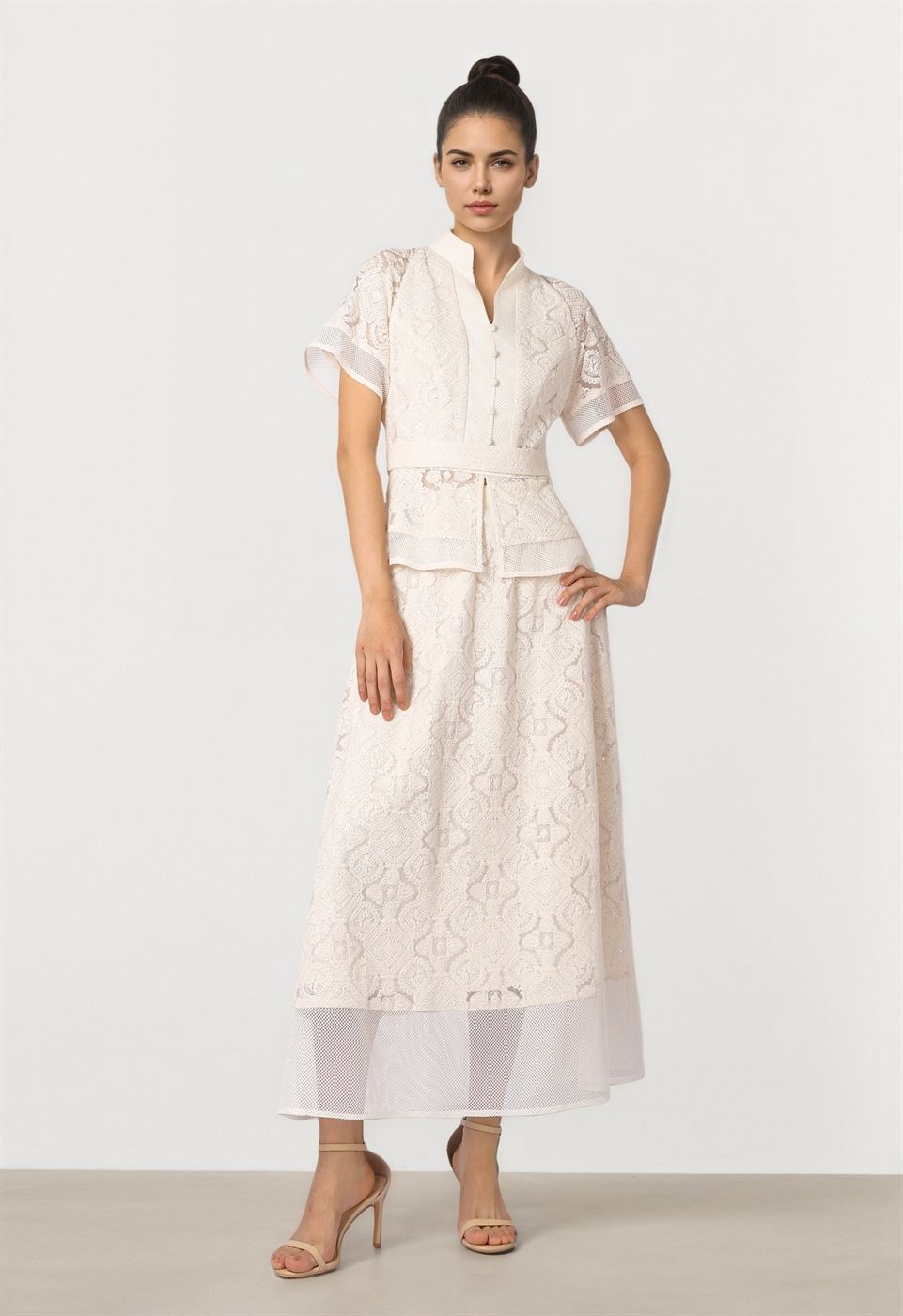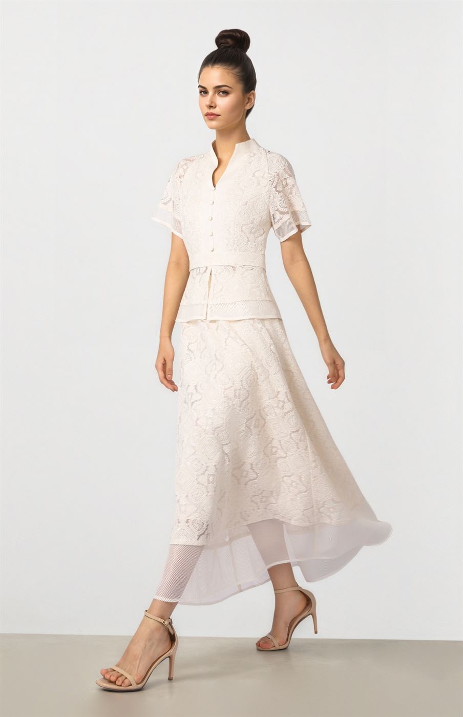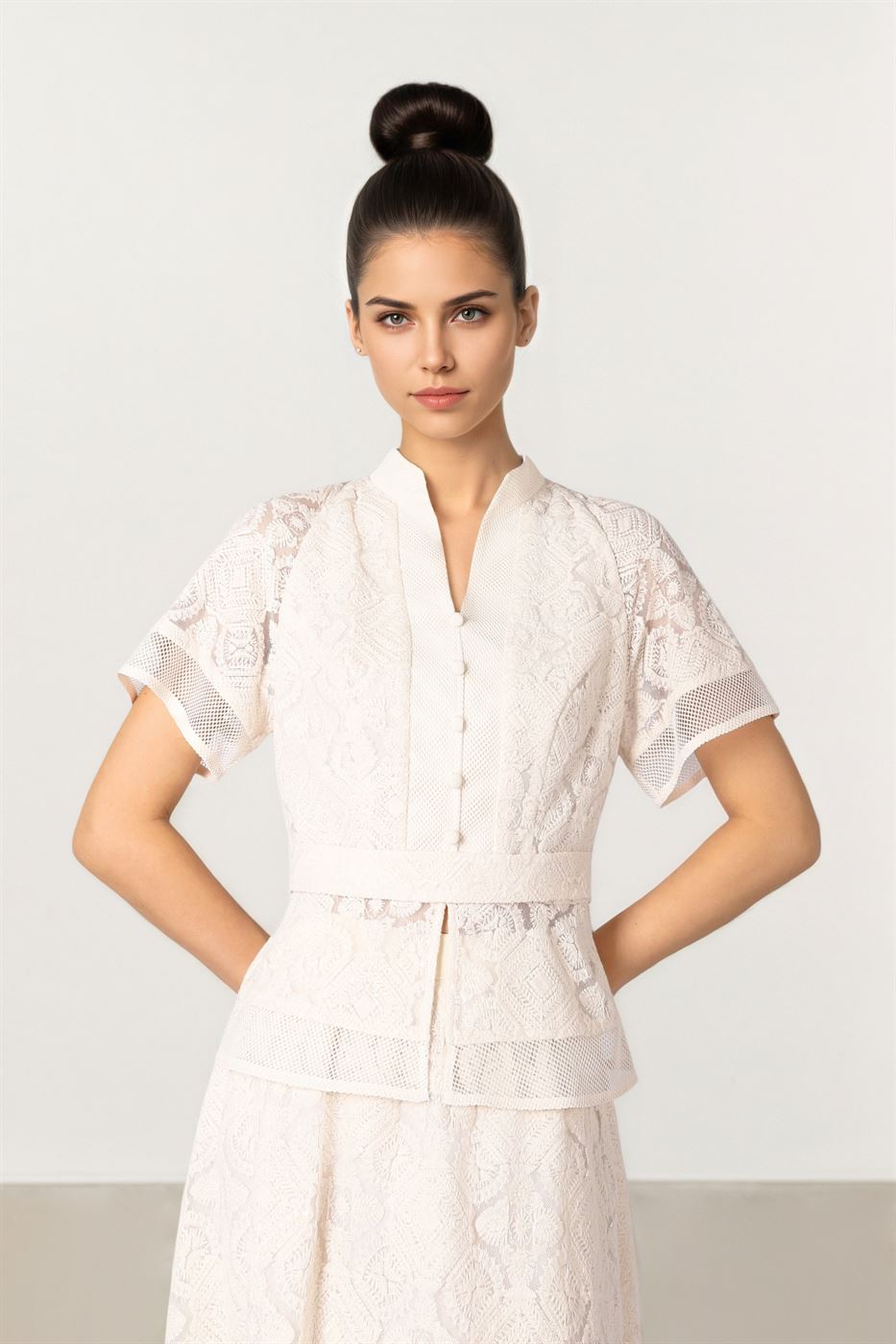 Description: Off-white peplum blouse crafted from cotton lace with a delicate textured finish. Designed with short sleeves, a fitted waist, and a softly flared hem that enhances femininity. Lightweight lace fabric offers breathability with a refined, elegant look.