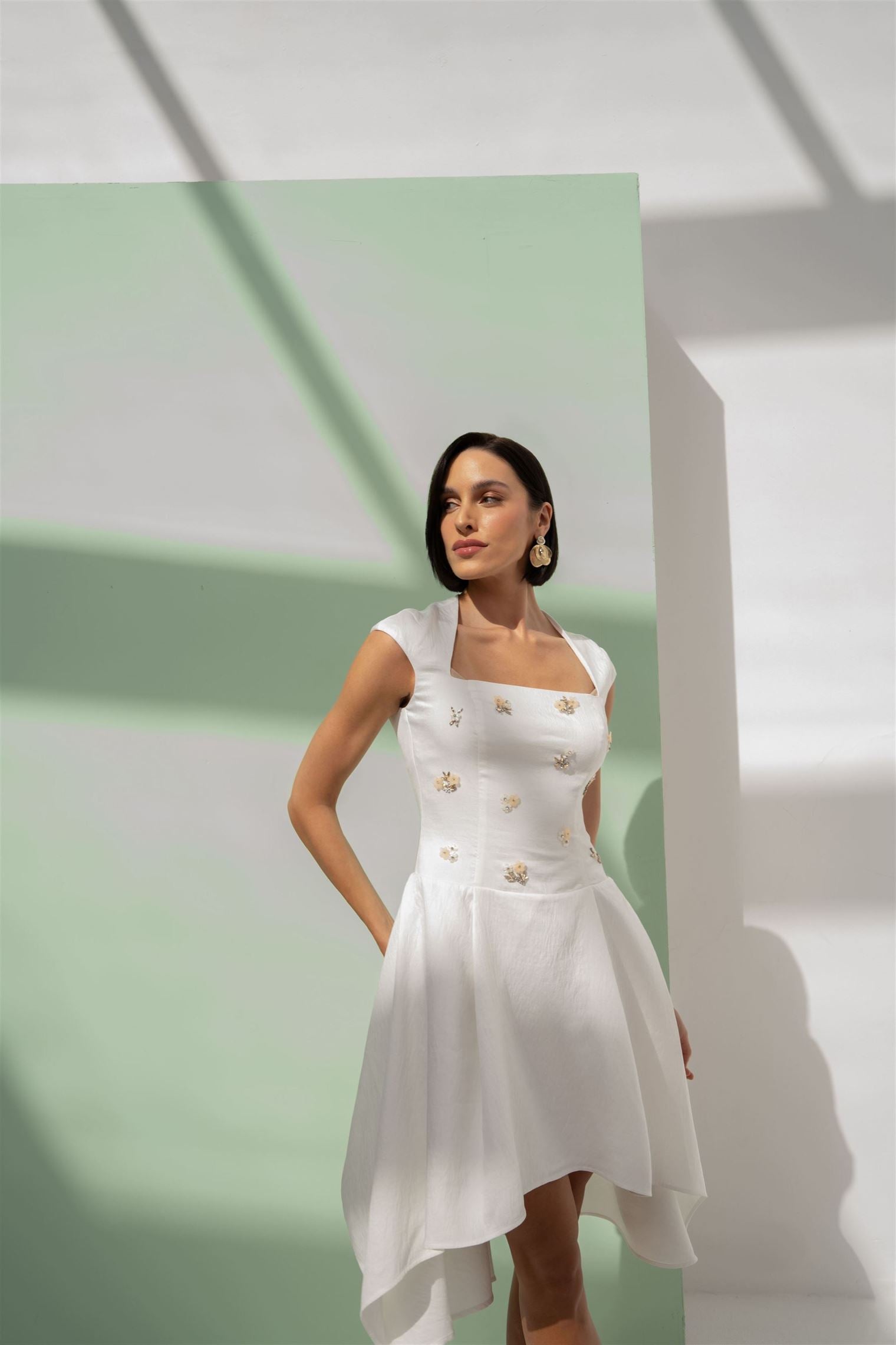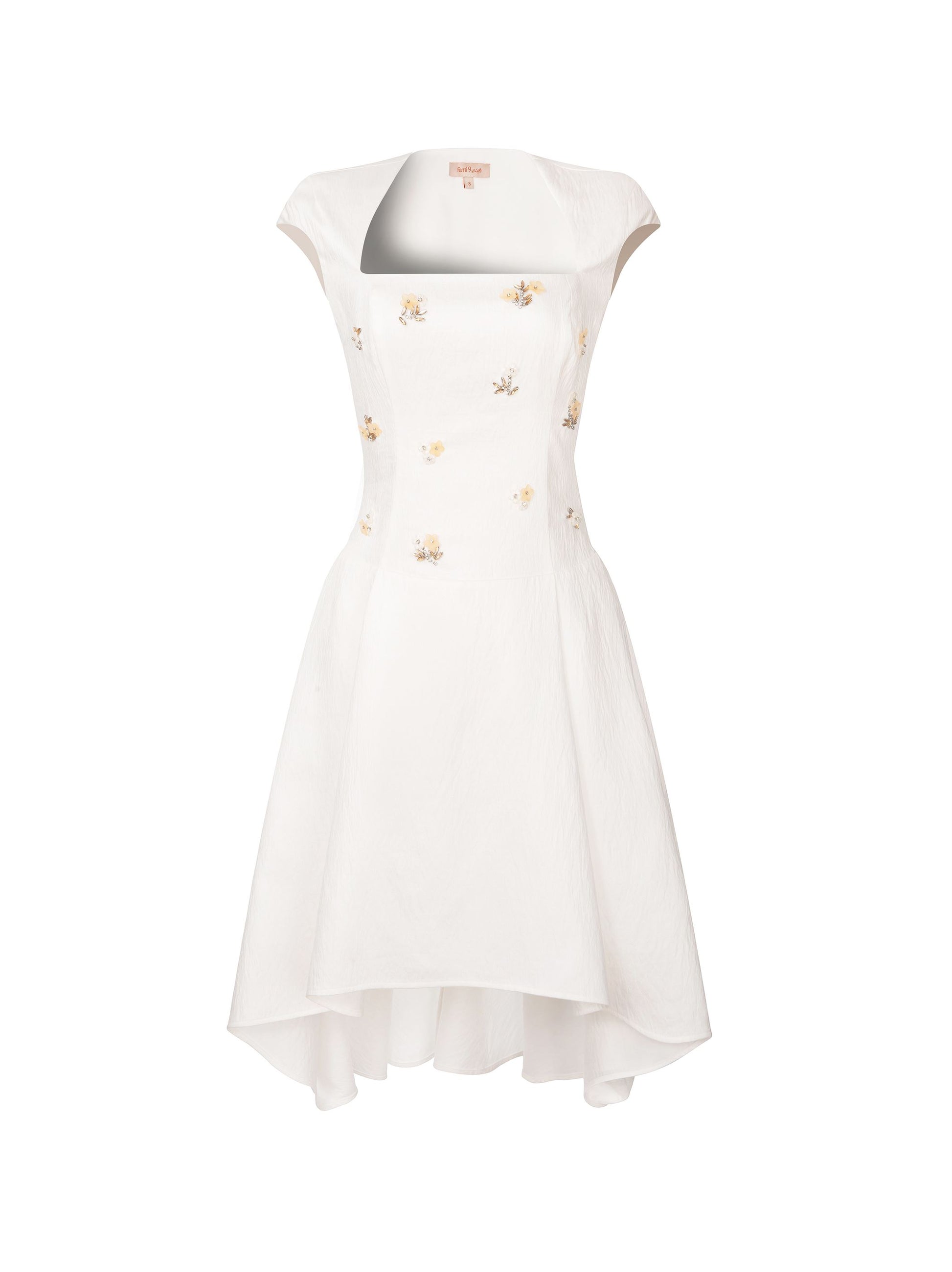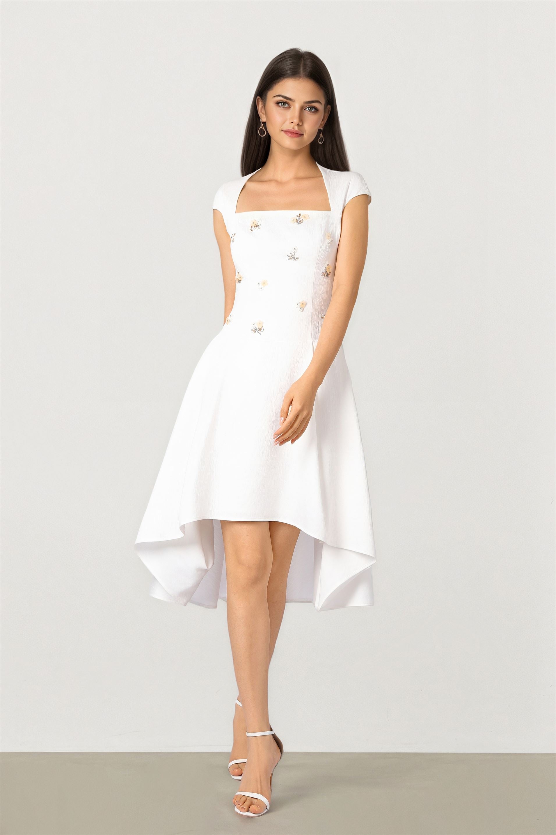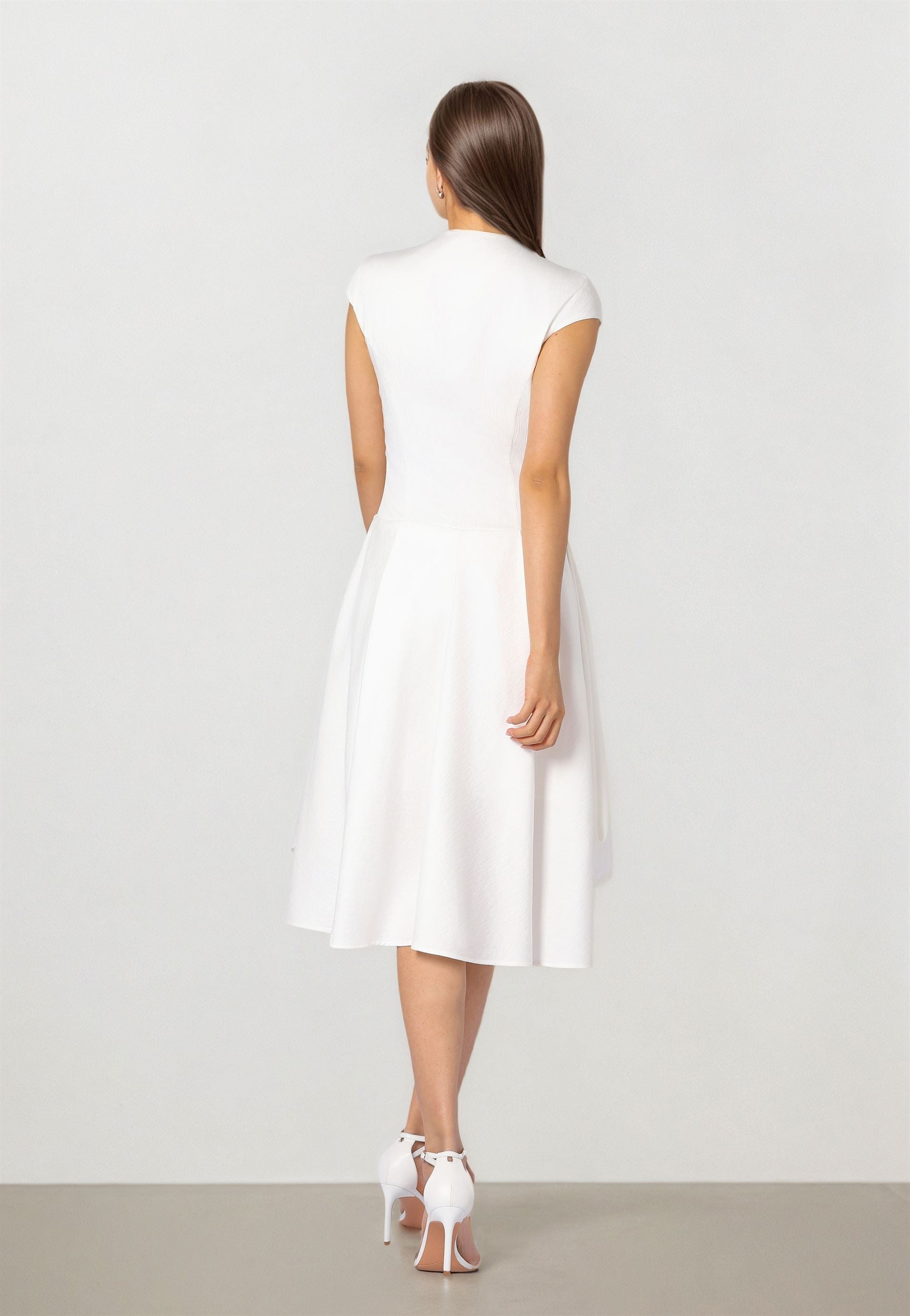 Description: Off-white crepe midi dress with a fitted bodice and elegant front embellishment for a polished statement. Designed with short sleeves and an asymmetric hem that adds modern movement to the silhouette. Finished with a side invisible zipper for a clean look and smooth wear. Ideal for occasions when you want minimal elegance with standout detailing.