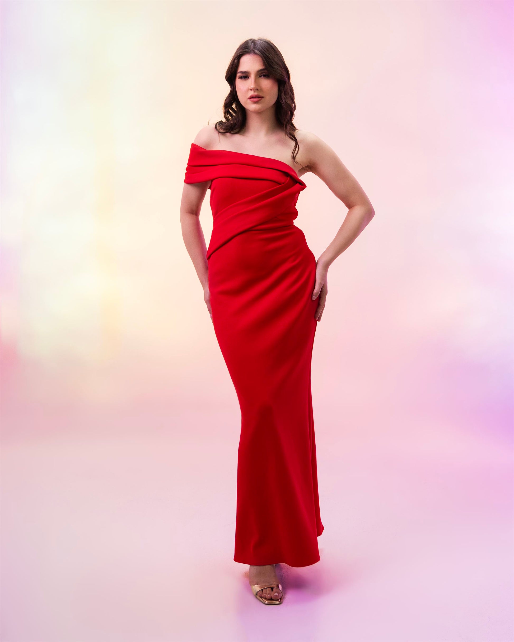 Description: This striking red column dress is crafted from structured neoprene fabric for a sleek and sculpted silhouette. Designed with a slanted neckline and a single sleeve, it features a bold statement ruffle that adds drama and elegance. The fitted column skirt enhances the figure, making this dress a standout choice for formal evenings and special occasions.