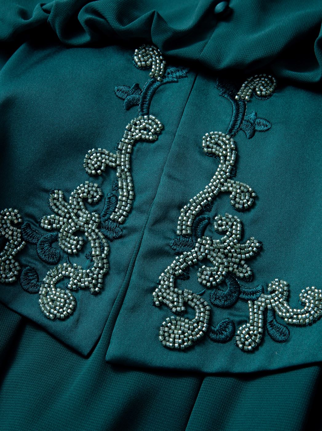Description: Deep teal dress crafted from a chiffon and satin blend. Designed with soft draping, long sleeves, and a fluid silhouette that moves gracefully. The layered fabrics create depth and elegance, making it ideal for evening or occasion wear.