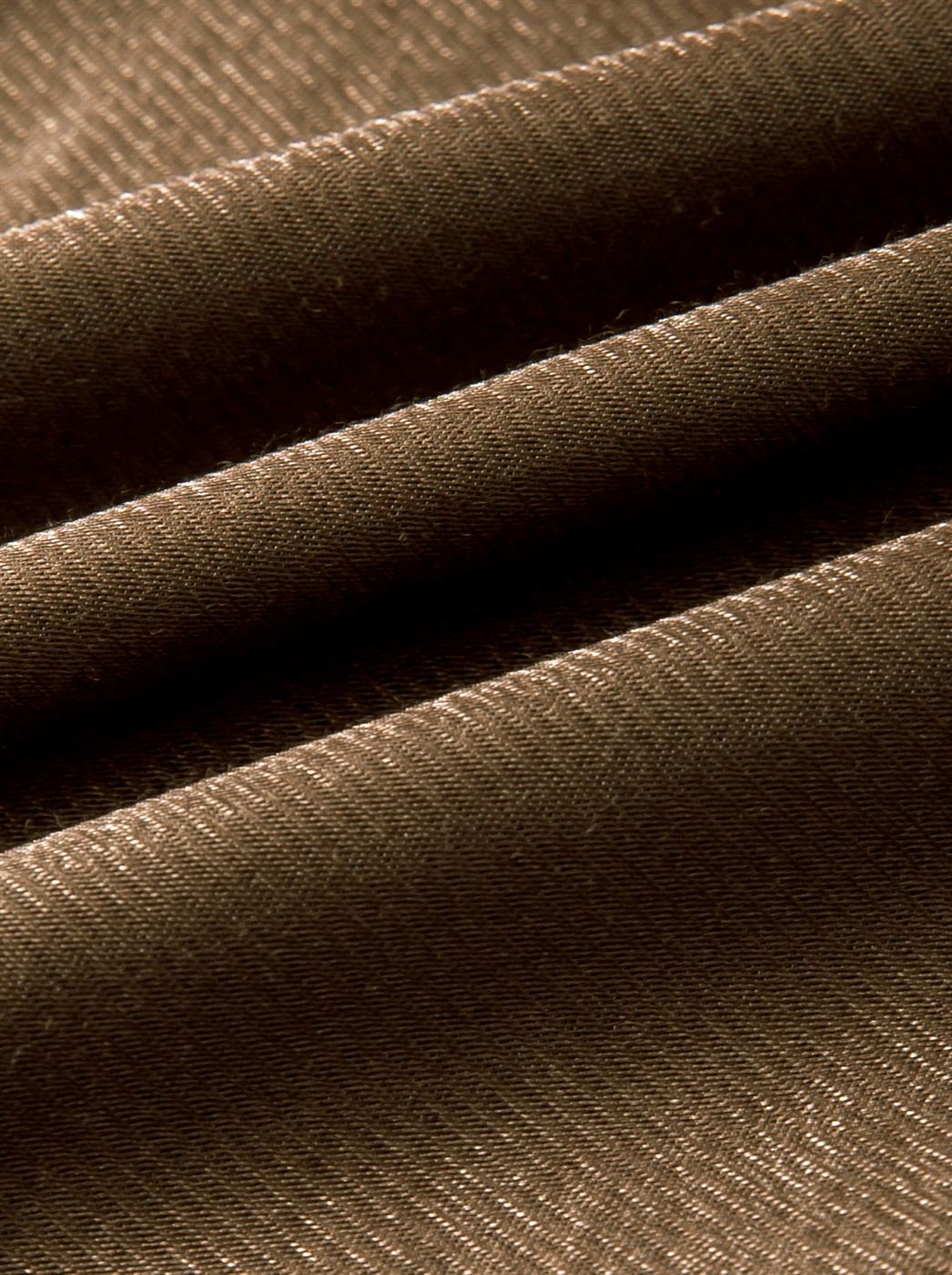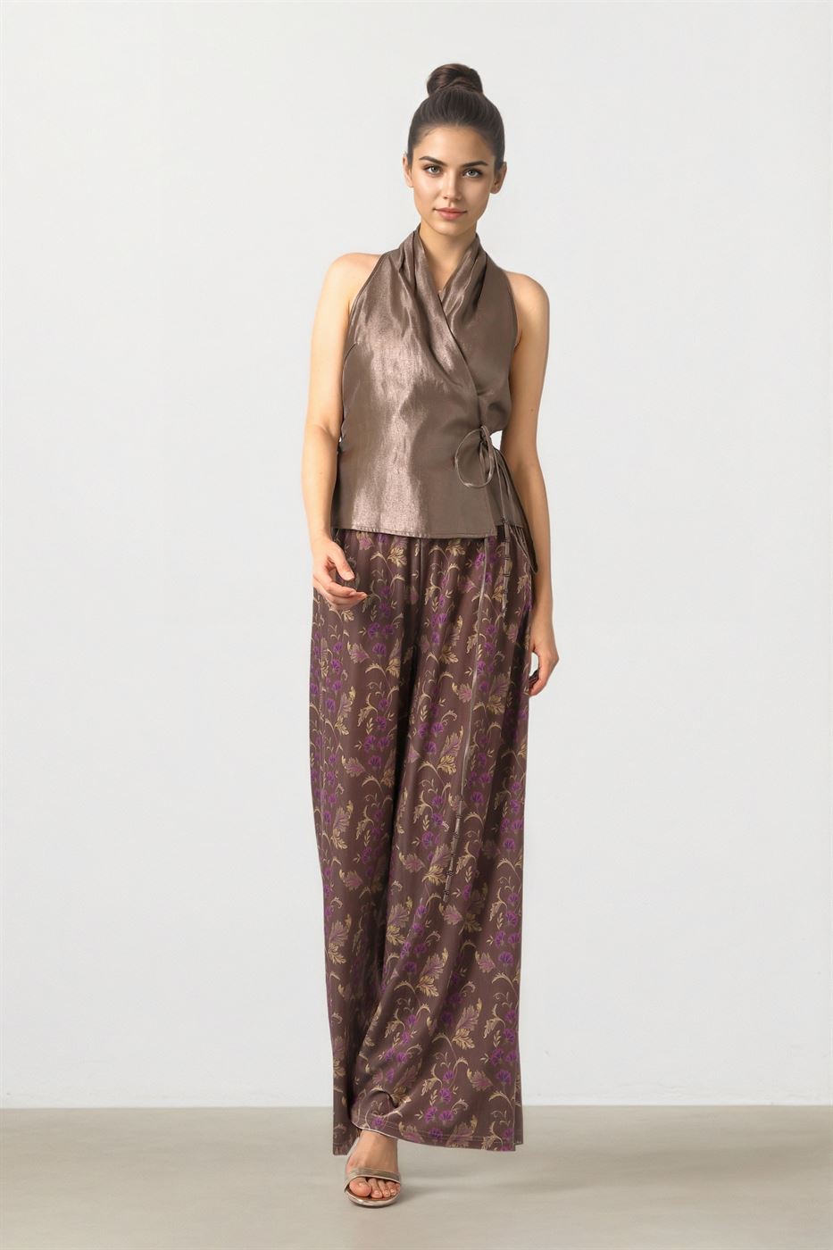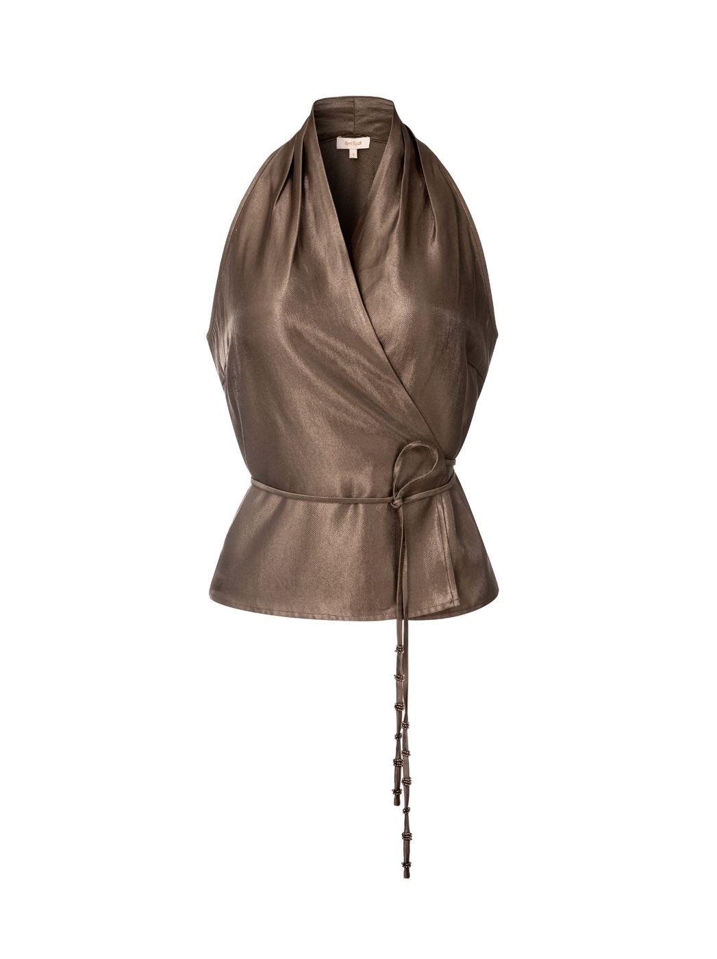Description: Sleeveless taffeta top in a deep coffee shade, designed with a wrap-style front that adds structure and elegance. The smooth taffeta fabric provides a subtle sheen, creating a refined silhouette suitable for elevated styling.